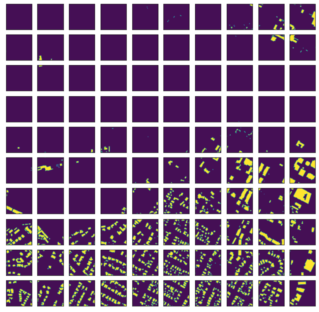 The predictions of one of the first versions of the model trained to identify buildings in satellite images.