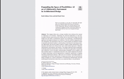 Saldana Ochoa, Karla, and Judi Shade Monk. "Expanding the Space of Possibilities: AI as a Collaborative Instrument in Architectural Design." In Architecture in the AI Era for Research, Practice, and Pedagogy, pp. 73-89. Singapore: Springer Nature Singapore, 2026.
